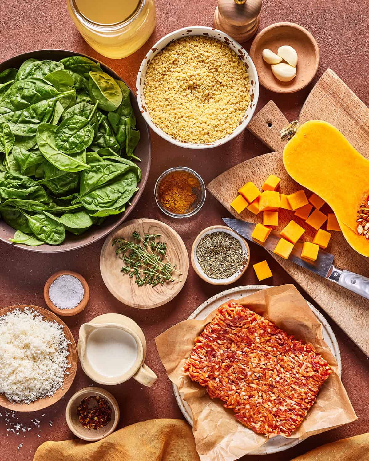 The magic is in the ingredients of course — savory Italian sausage cooked down with golden turmeric, fresh thyme, and a sprinkle of red pepper flakes that gives just the right amount of heat. The broth turns creamy and full-bodied once the parmesan and cream are added, while tender butternut squash adds a hint of sweetness that balances everything perfectly. The tiny pasta — stelline or orzo — gives each spoonful a little texture, and the spinach folds in at the end for that fresh, vibrant finish.
