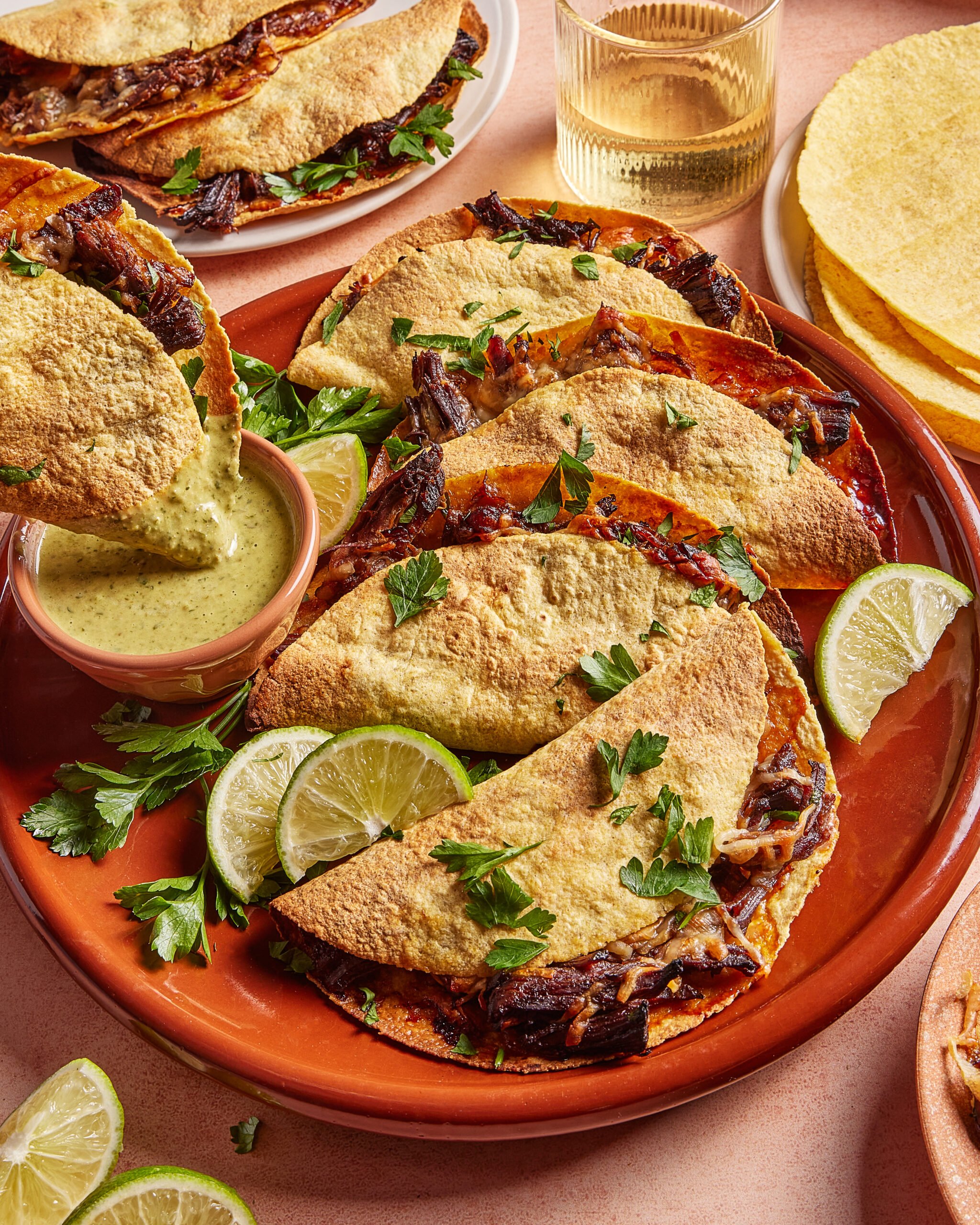 These are also so easy to make. You just warm up your tortillas so they’re pliable (this is key!), fill them with spicy cheddar and that juicy chuck roast, fold them in half, and bake them between two trays so they crisp up and hold their shape.