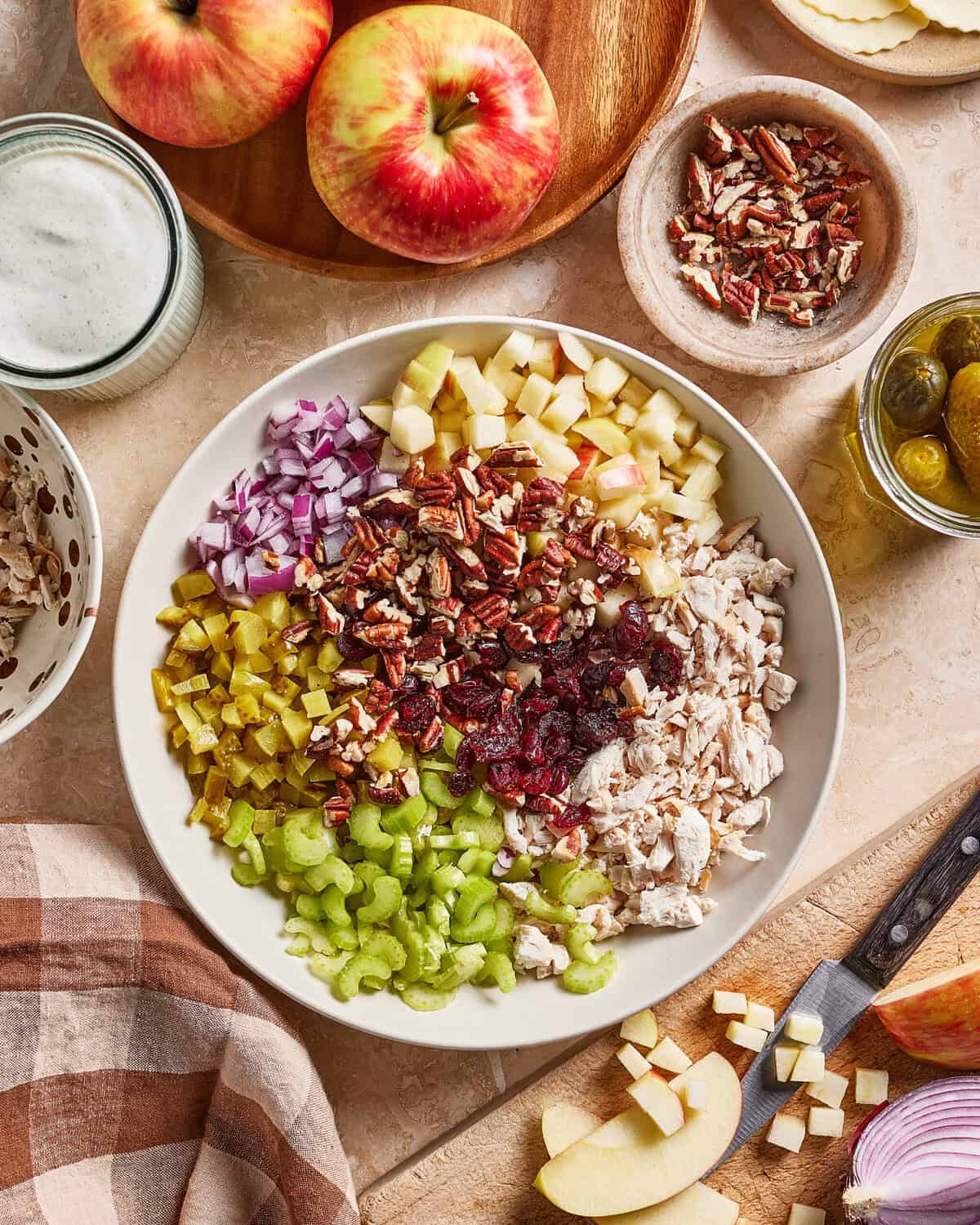 - Next, prepare the chicken salad. In a large mixing bowl, add the shredded chicken, sliced celery, diced red onion, dried cranberries, chopped pecans, chopped pickles, and chopped apple.
