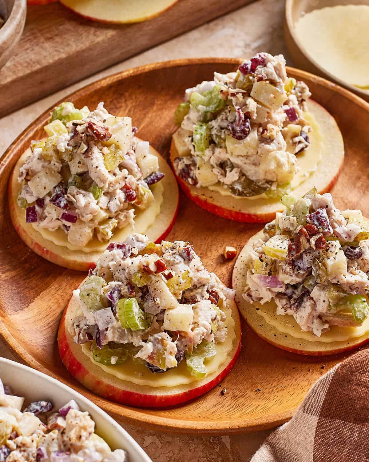 - Finally, scoop a generous spoonful of chicken salad onto each cheddar-topped apple slice.