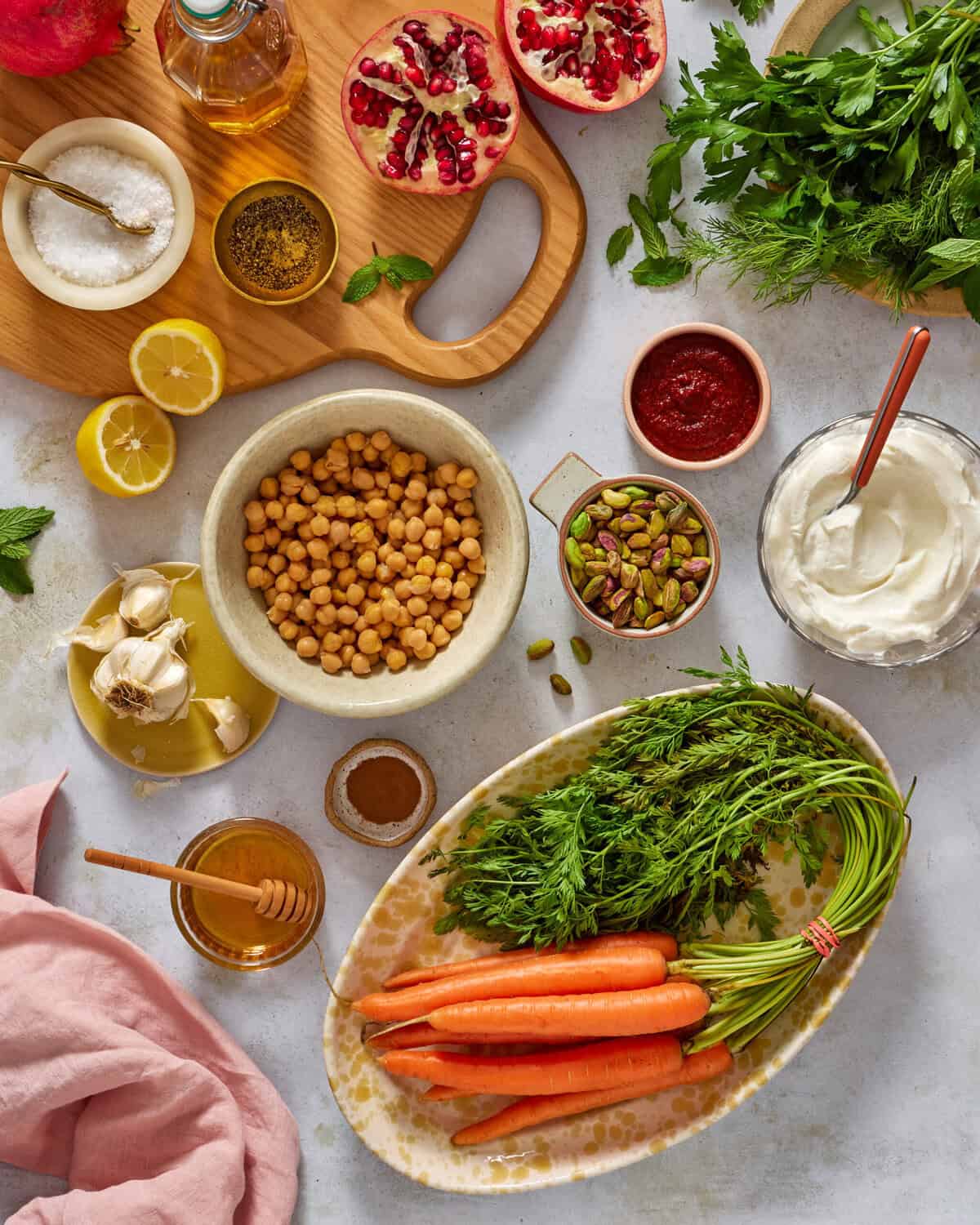 - To assemble, spread the herby yogurt across a serving platter, top with the roasted honey-harissa carrots and chickpeas, drizzle with the pistachio pesto, and garnish with pomegranate arils if desired. Serve immediately.
