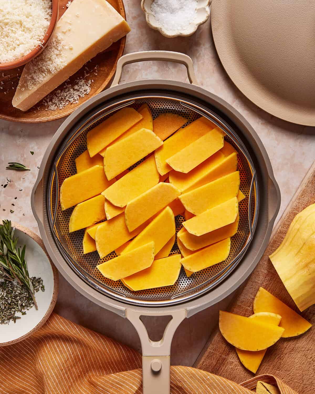 Next, you’ll want to soften the squash just enough so it bends without breaking. If you’re steaming on the stove, place the slices in a steamer basket over simmering water for a few minutes until they’re pliable. If you’re using an Anyday bowl, add the squash with a splash of water, cover with the vented lid, and microwave for about 3–4 minutes. In either case, gently pat the slices dry once they’re done — this helps everything crisp up later.