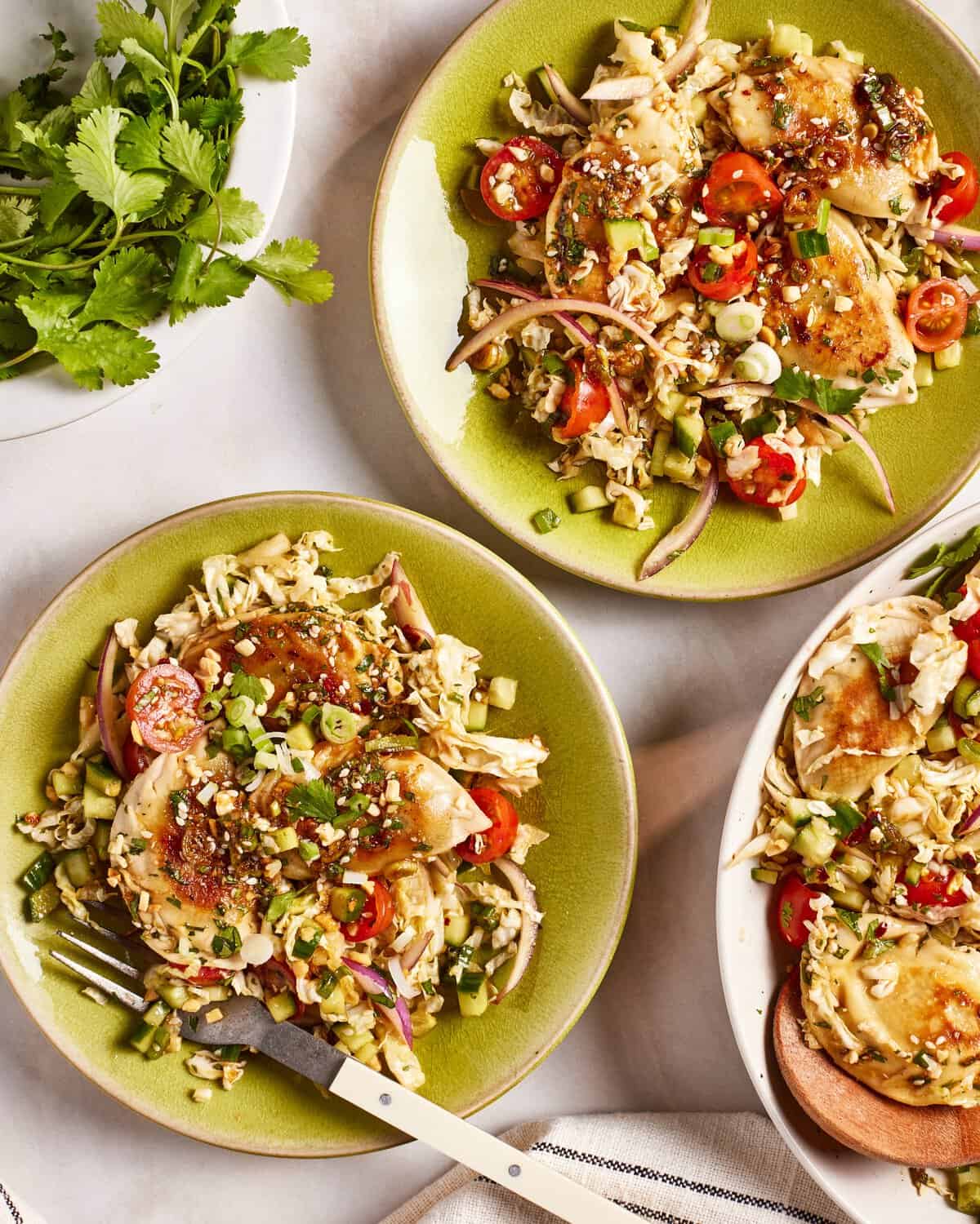 - Next, prepare the dressing. Add all of the dressing ingredients (the soy sauce or coconut aminos, rice vinegar, toasted sesame oil, garlic, ginger, sesame seeds, coconut sugar, chili crisp, green onions, and cilantro) to a bowl and whisk them until they're fully combined. The dressing will be thick – if you prefer a thinner dressing, add 2-3 tablespoons of water to the dressing until it reaches your desired consistency.