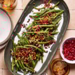 Then, transfer the green beans on top of the whipped feta, alongside the remaining pistachio mixture.