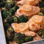 Place broccoli florets around the chicken. spray them with coconut oil and sprinkle with parmesan cheese.
