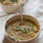 Transfer 3/4 of the soup to a high speed blender and blend for 30 seconds.