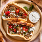 Spread a dollop of the tzatziki on top of each pita, then layer the gyro meat on top.