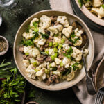 Pour in the broth and the parsley and stir everything together. Then, reduce heat to low, and cover. Let simmer for about 10-12 minutes, until the liquid is absorbed. You’ll want to keep an eye on it to ensure that the cauliflower doesn’t get soggy, and still maintains some bite to it!