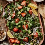 "The perfect summer salad doesn't exist," that is... until now. Meet my Strawberry Arugula Salad with lemon Poppyseed Dressing, aka the perfect salad for your late summer days. Peppery arugula blends beautifully with the sweet strawberries and the tangy lemon dressing. It's light, refreshing, and bursting with flavor. Plus, it's gluten-free, with the option to make it dairy-free and vegan-friendly, so it's perfect for parties or social gatherings!