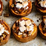 Scoop some of the pecan-maple-cinnamon mixture onto each potato slice (about 1 tablespoon). Cover again with the foil, and put them back in the oven for another 12 minutes.